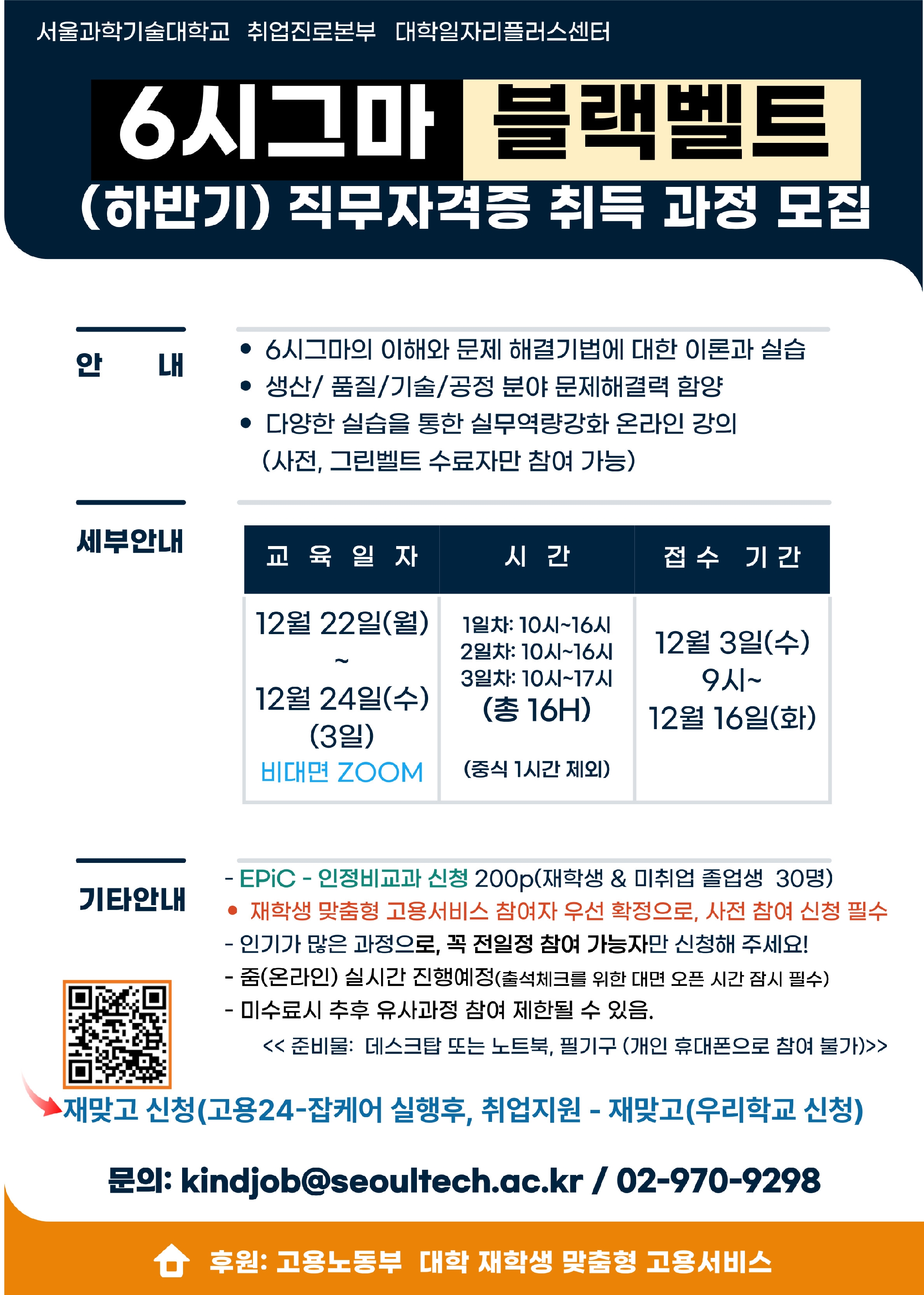 우리학교 외 기관에서 6시그마 수료하신 분들은 EPiC 신청 후, 수료증을 위 이메일 kindjob@seoultech.ac.kr 로 보내주시고, 선착순안에 들었어야 최종 참여자 확정됩니다!