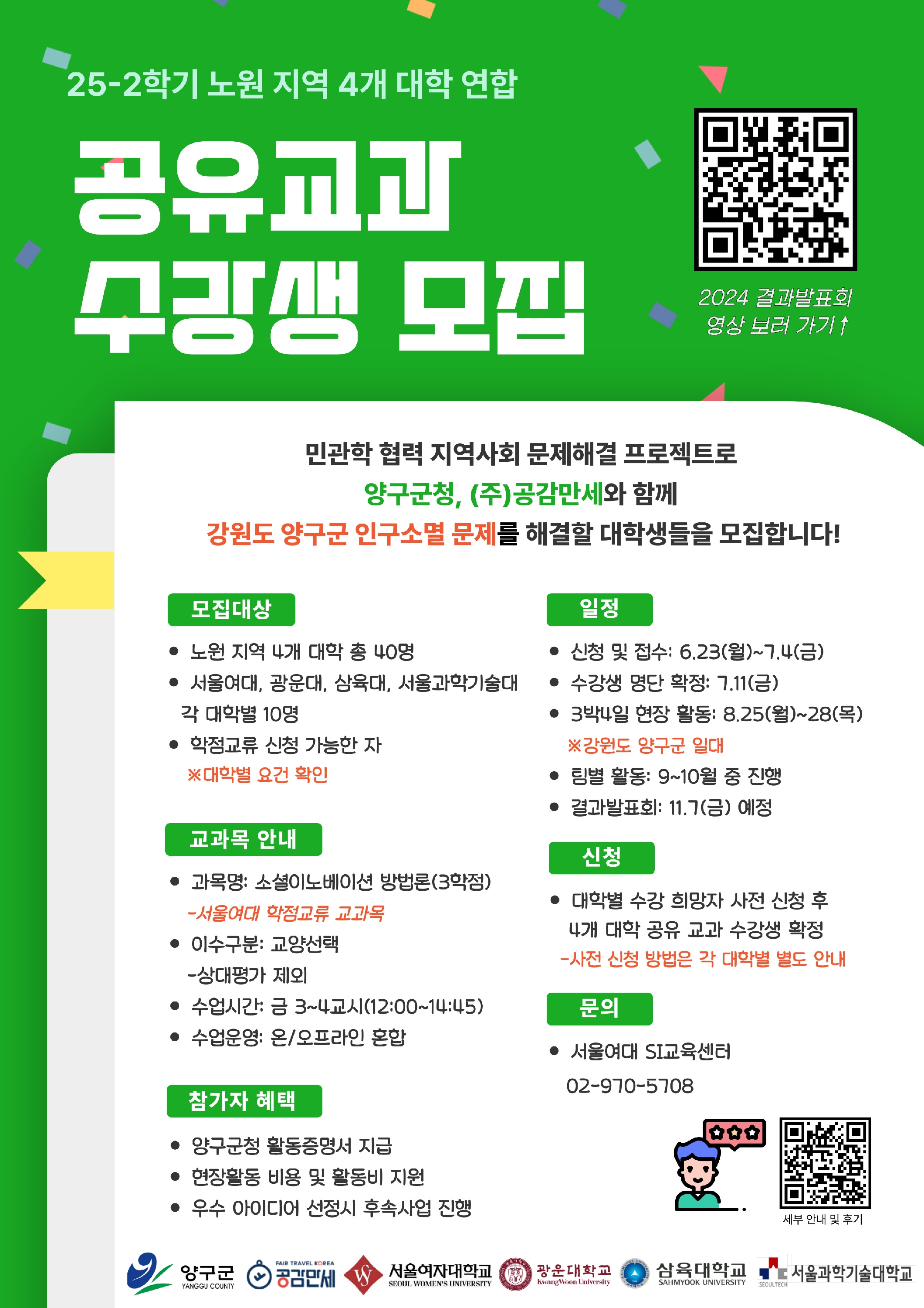 * 운영형태: 학점교류를 통한 노원 4개 대학 교양교과수업 운영 * 참여대학: 서울과학기술대학교, 서울여자대학교(수업개설), 광운대학교, 삼육대학교 * 교과목 안내 - 개설학기: 2025-2학기 - 학점(이수시간): 3학점(45시간) - 과 목 명: 소셜이노베이션 방법론 - 이수구분: 교양선택, 상대평가 제외) - 수업시간: 금3~4교시(12:00~14:45) ※ 집중이수제 운영으로 실제 수업시간 변동 있음. ※ OT, 현장활동, 결과발표회 필참 - 운영방식: 온오프라인으로 운영 ※ 양구군 실제 문제를 다루는 PBL(Project/Problem-d-Learning) 기반 수업 구성 ※ 온라인-양구군 현장-강의실을 순환하는 블렌디드 러닝 ※ 15주(45시간) 수업 시간을 유연하게 적용하기 위한 집중이수제 활용 * 일정 - 오리엔테이션: 2025.8.22(금) 10:30~12:00(온라인) - 3박4일 현장활동: 2025.8.24.(월)~28.(목) / 강원도 양구군 - 팀별 활동: 2025.9. ~ 10. 온/오프라인 활동 - 최종발표회: 2025.11.7.(금), 서울여대(예정) * 수강희망자 사전 모집인원 및 신청방법, 기한 - 모집인원: 10명(총 40명, 각 대학별 10명씩) - 신청기한: 2025.7.4.(금)까지 (선착순 모집으로 조기에 마감될 수 있음) - 서울과기대 학생 신청 QR코드 * 주의사항 - 이 수업은 서울여대에서 교과목(교양선택)으로 개설되나, 학점 인정여부는 신청학생 소속 대학 상황에 - 학점교류 신청 시 소속 대학별 자격 요건 및 관련 규정을 확인 바람 - 선착순 모집으로 조기에 마감될 수 있음 * 자세한 사항: 서울과학기술대학교 대학알림 공지사항(클릭) * 문의사항: 서울과기대 담당자(02-970-9764, jsj@seoultech.ac.kr) |