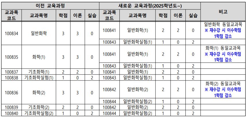 □ 참고사항 가. 일반화학(이론), 일반화학실험(실습) 과목은 개별 운영되나, 가급적 함께 수강을 권고 나. 재수강 시 이수학점이 감소하는 과목이 있으니 확인 다. 강좌는 교양대학 내에 개설, 강좌 관리는 정밀화학과에서 총괄 라. 문의: 정밀화학과(☎02-970-6682) |