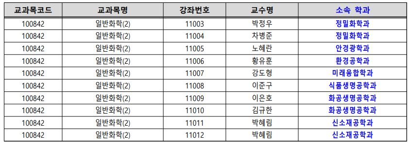 □ 교양강좌 화학 수강신청 안내 가. 100841 일반화학(1) : 단과대 및 학과 제한 없음, 정원 50명 내외 나. 100842 일반화학(2) : 학과별 분반 구분(권장), 정원 50명 내외 ※ 시스템상 수강제한 없으나, 원활한 수업 운영을 위해 본인 소속 학과의 수업으로 신청해주시기 바람. 다. 100843 일반화학실험(1) : 단과대 및 학과 제한 없음, 정원 32명 내외 라. 100844 일반화학실험(2) : 단과대 및 학과 제한 없음, 정원 32명 내외