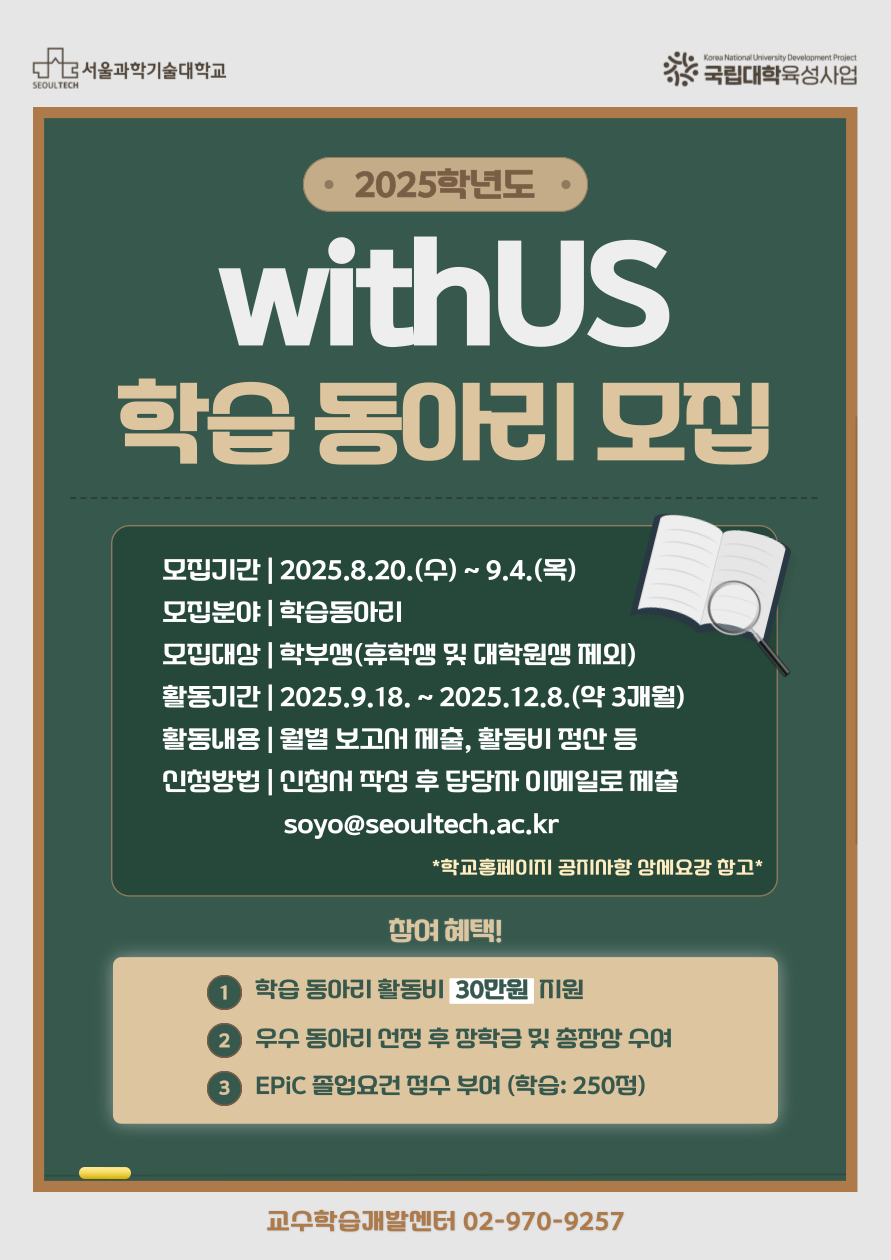 [모집 대상] 2학기 교과목 학습을 목표로 하는 학부생 3인 이상 동아리 *(붙임1) 2025학년도 withUS 학습동아리 모집 공고' 필독