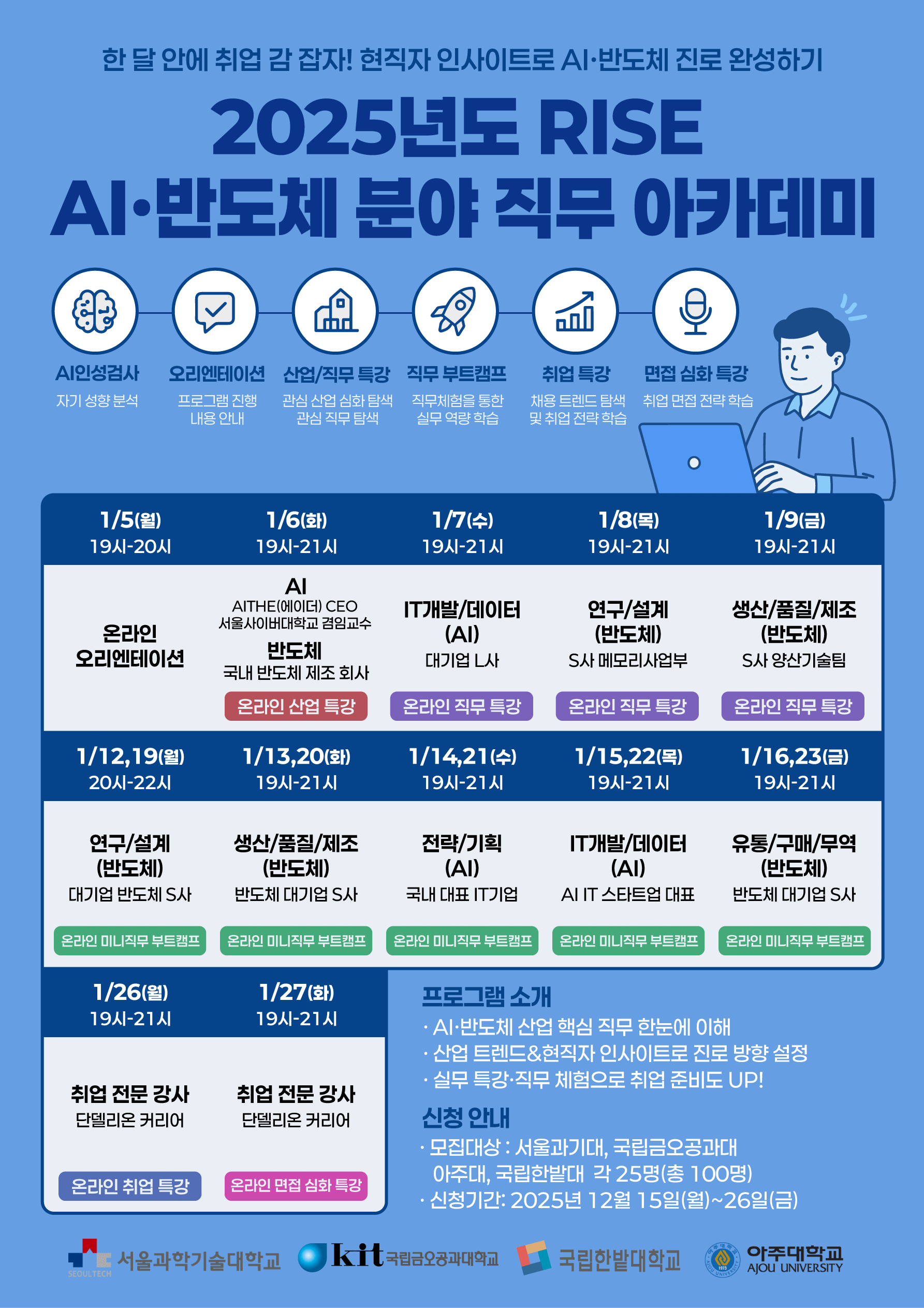 □ 사업명: 2025년도 RISE AI·반도체 분야 직무 아카데미 □ 사업내용: 직무 아카데미 전문 기업을 통해 취업 준비단계에 있는 학생의 직무 역량을 강화하여 AI·반도체 분야의 전문 인력 양성 및 취업 지원 □ 교육기간: 2026. 1. 2.(금)~27.(화) □ 주관: 서울과학기술대학교 □ 지원대상: 서울과학기술대학교 재학생 25명 □ 주요내용 ○ AI 인성 검사, 오리엔테이션, 산업 및 직무 특강, 직무 부트캠프, 취업 특강, 면접 심화 특강 등(전 과정 온라인으로 진행) ○ 출석률 80% 이상 시 'RISE사업단장' 이수증 발급 □ 프로그램 세부 사항: [첨부파일 1] 참고 □ 신청안내 ○ 모집기간: 2025. 12. 26.(금)까지 ○ 모집대상: 서울과학기술대학교 재학생(선착순 마감, 정원 25명) ○ 신청방법: Epic folio에서 신청 ※ 추후 선착순 마감 25명에 한하여 프로그램 선택 사항 확인과 관련한 수요 조사 실시 예정 ○ 결과발표: 2025. 12. 31.(수)까지 □ 기타사항 ○ 반드시 프로그램의 일정, 진행 시간 등을 숙지하여 신청해 주시기 바랍니다. ○ 본 직무 아카데미는 전부 온라인으로 진행되오니 참고 바랍니다. ○ 본 직무 아카데미의 세부 프로그램 중 선택하여 수강하는 프로그램이 있어, 해당 내용을 반드시 숙지하여 추후 수요 조사 시 반영하여 주시기 바랍니다. □ 문의처: RISE사업단 인재육성팀(02-970-9115, h5021543j@seoultech.ac.kr)