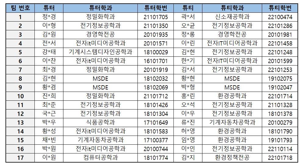 1) 선정결과 - 총 17팀 (34명: 첨부파일 참조, 학번으로 검색하여 명단 확인)