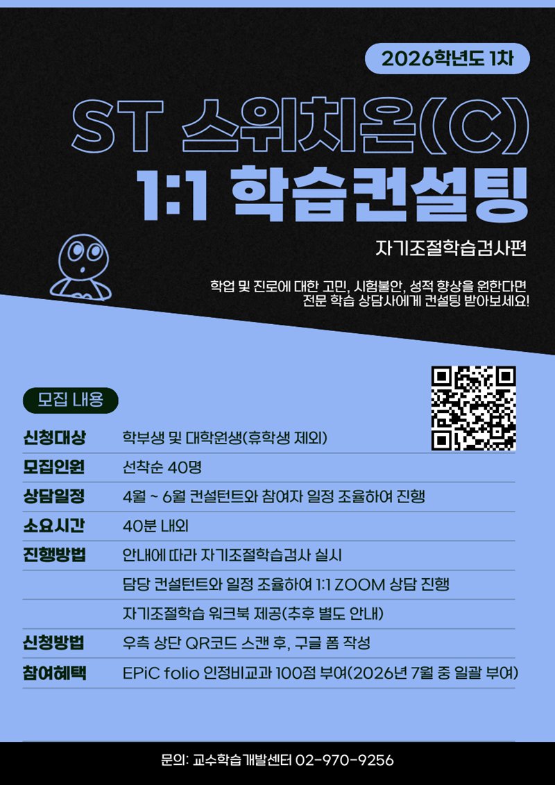 교수학습개발센터에서 2026학년도 1차 ST 스위치온(C) 참여자를 모집하오니, 학생 여러분의 많은 관심과 참여 바랍니다. 1. 신청대상: 학부생 및 대학원생(휴학생 제외) 2. 모집기간: 2026.04.01.(수)~ 선착순 40명 마감 시까지 3. 신청방법: 포스터 내 QR코드 스캔하여 구글 폼 작성 후 제출 4. 진행방법: 각 단계별 별도 안내 예정 ① 자기조절학습검사(SLT) 온라인 실시 ※ 146문항, 약 50분 ② 전문컨설턴트와 1:1 ZOOM(비대면 실시간) 상담 진행 ※ 개별 일정 조율하여 진행 ③ 상담 종료 후 컨설턴트 안내에 따라 만족도 조사 참여 ④ 자기조절학습 워크북 제공 ※ 교수학습개발센터 방문 수령(추후 별도 안내) |